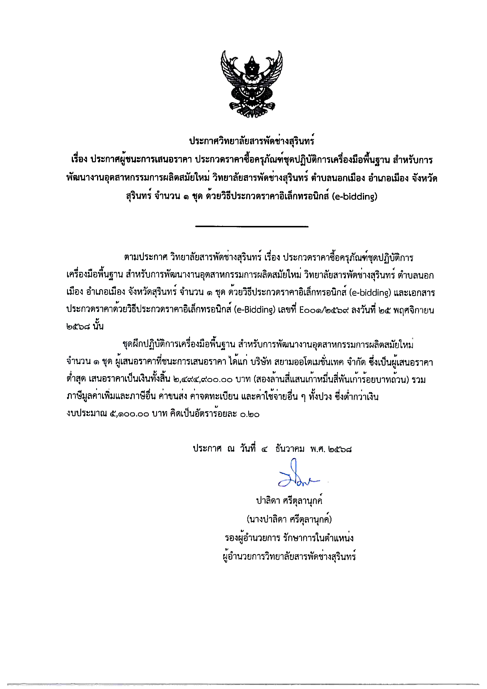 04/12/68: ประกวศผู้ชนะการเสนอราคา ประกวดราคาซื้อครุภัณฑ์ชุดปฏิบัติการเครื่องมือพื้นฐาน สำหรับการพัฒนาอุตสาหกรรมการผลิตสมัยใหม่ จำนวน 1 ชุด ด้วยวิธีประกวดราคาอิเล็กทรอนิกส์ (e-bidding)
