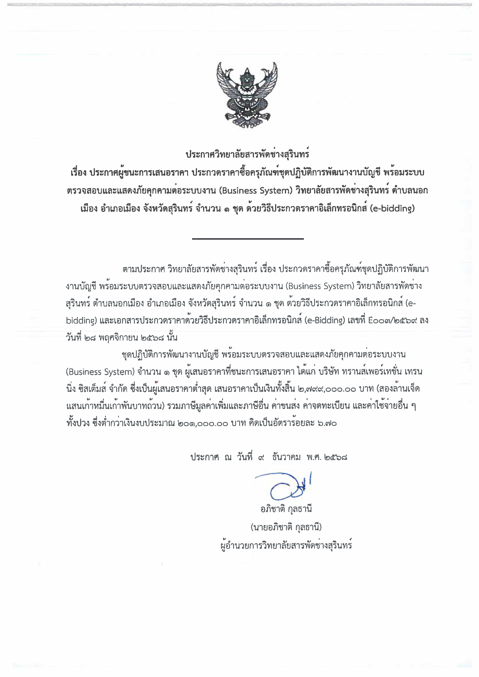 11/12/68: ประกวศผู้ชนะการเสนอราคา ประกวดราคาซื้อครุภัณฑ์ชุดปฏิบัติการพัฒนางานบัญชี พร้อมระบบตรวจสอบและแสดงภัยคุกคามต่อระบบงาน (Business System) จำนวน 1 ชุด ด้วยวิธีประกวดราคาอิเล็กทรอนิกส์ (e-bidding)