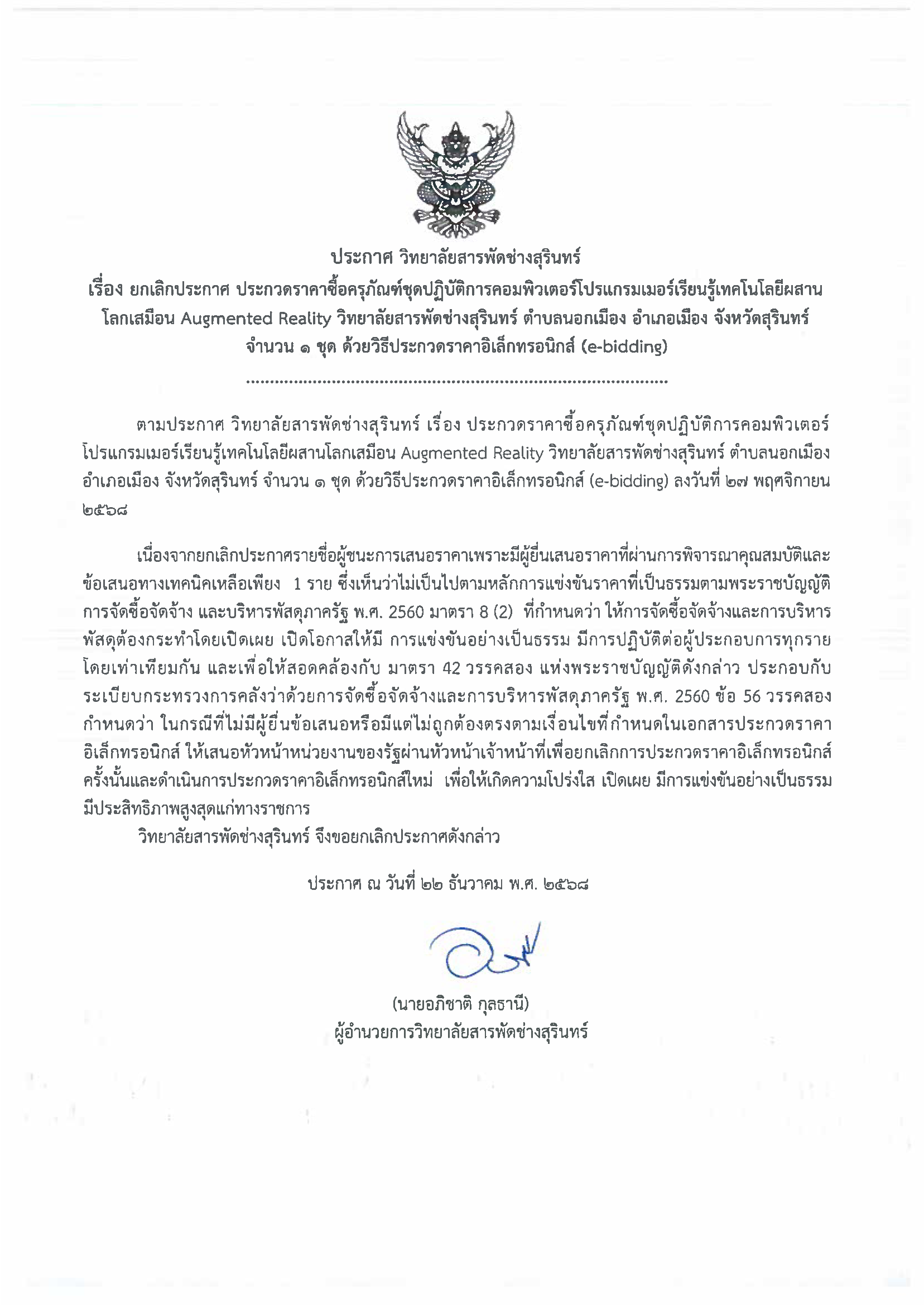 22/12/68: ประกวศยกเลิกรายชื่อผู้ชนะการเสนอราคา และประกาศยกเลิก ประกวดราคาซื้อครุภัณฑ์ชุดชุดปฏิบัติการคอมพิวเตอร์โปรแกรมเมอร์เรียนรู้เทคโนโลยีผสานโลกเสมือน Augmented Reality จำนวน 1 ชุด ด้วยวิธีประกวดราคาอิเล็กทรอนิกส์ (e-bidding)